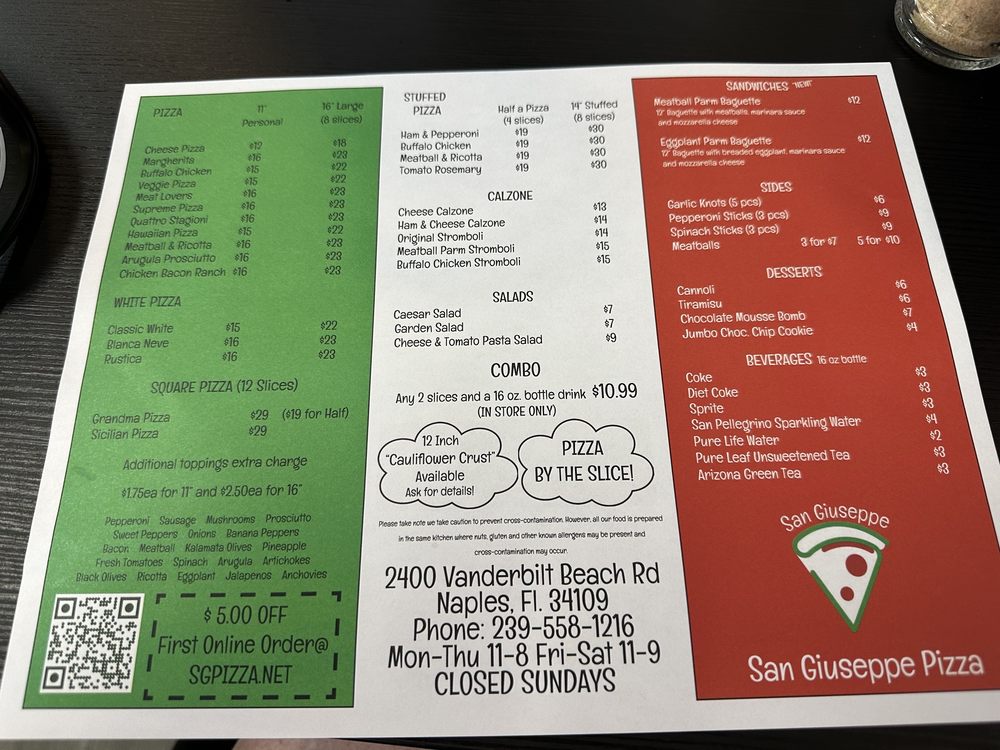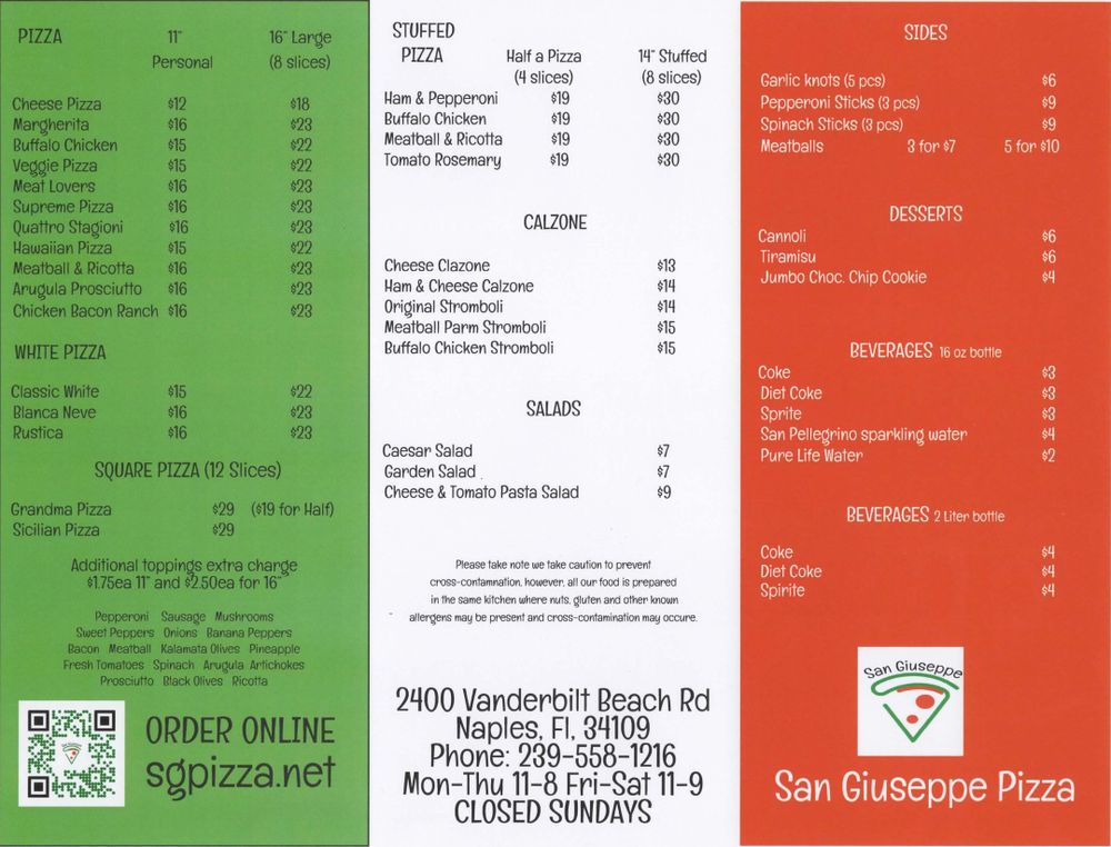 Welcome to San Giuseppe Pizza, where authentic Italian flavors meet modern convenience. Located in Naples, FL, this charming pizzeria specializes in delicious, handcrafted pizzas that will delight your taste buds. The menu is thoughtfully curated, featuring a variety of classic and specialty pizzas made from fresh ingredients.